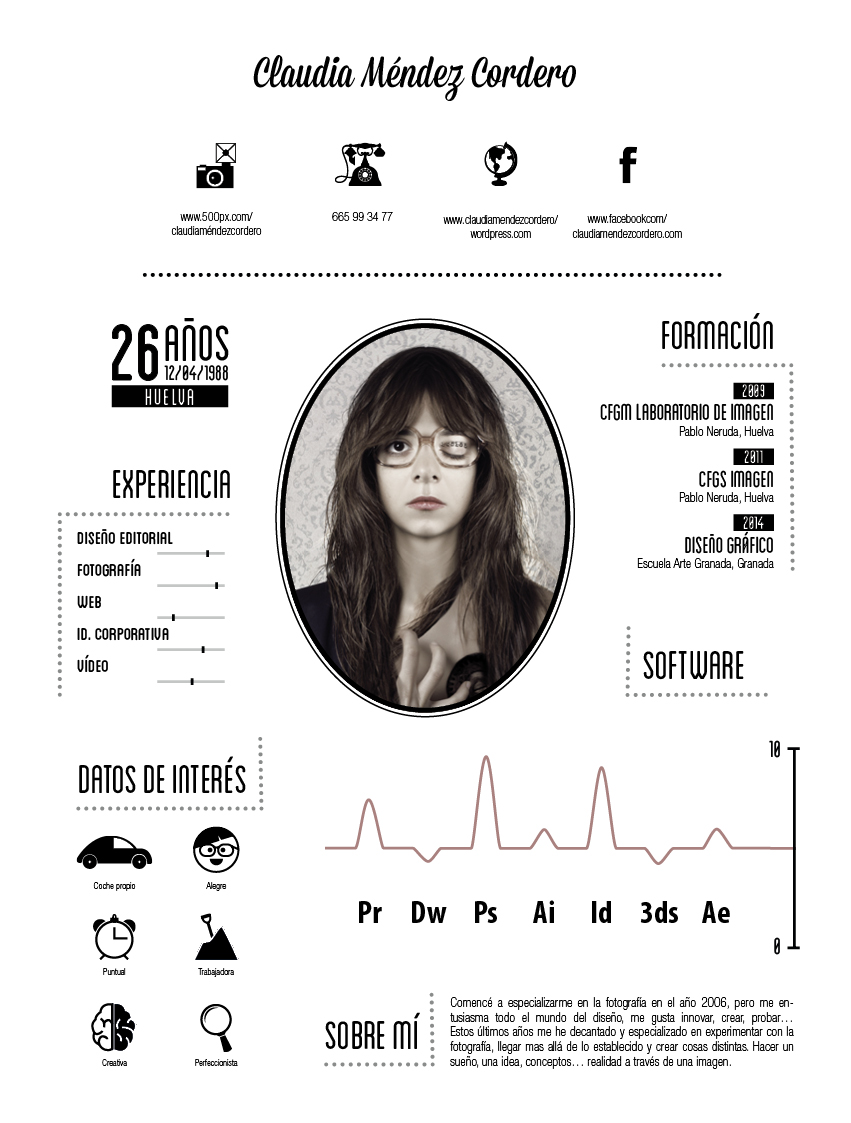 Mi nombre es Claudia, comencé en el mundo de la fotografía en el año 2006, pero me entusiasma todo el mundo del diseño. Me gusta innovar, experimentar y soy creativa. Nací en Huelva y estos últimos tres años los he dedicado a formarme en la Escuela Arte Granada desarrollando la diplomatura de Diseño Gráfico y producción multimedia.
